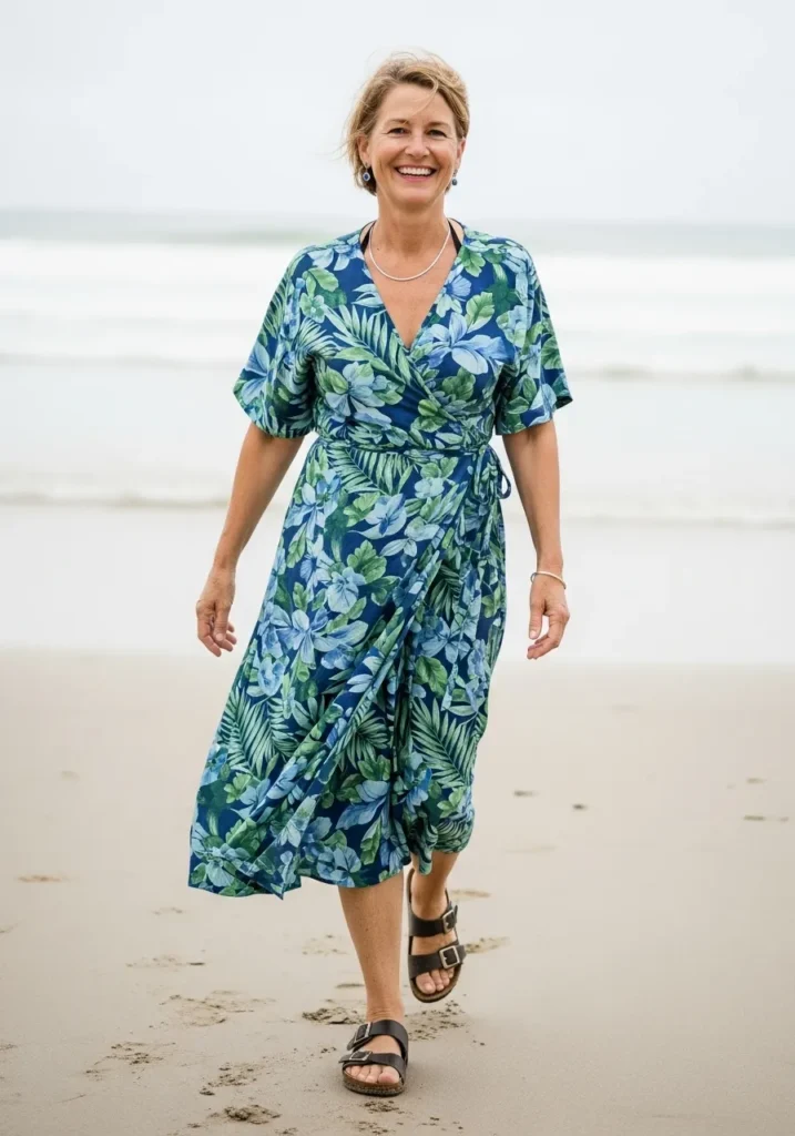 A wrap dress in blues and greens brings a breezy tropical print that feels right at home near the water. The lightweight fabric moves easily and the tie waist gives a flattering shape. Simple black sandals finish the outfit without stealing focus from the pattern.