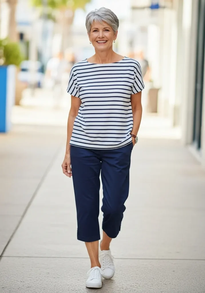 A striped navy and white top keeps things classic while navy capri pants offer comfort and ease. White sneakers make it perfect for a day of strolling around town or exploring the ship. The whole outfit feels clean and simple.