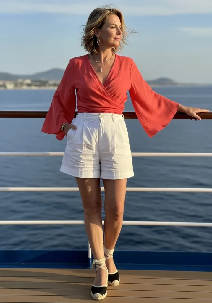 A coral wrap top brings bright energy and pairs well with tailored white shorts. The fabric feels airy and the sleeves give the outfit a soft movement. Simple espadrilles tie the look together with a classic warm weather vibe.