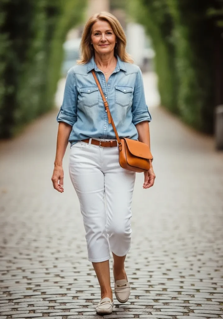 A light denim shirt sits neatly over white cropped pants. The rolled sleeves and soft cotton make the outfit casual while the tan belt and crossbody bag add warmth. Simple loafers keep everything grounded.