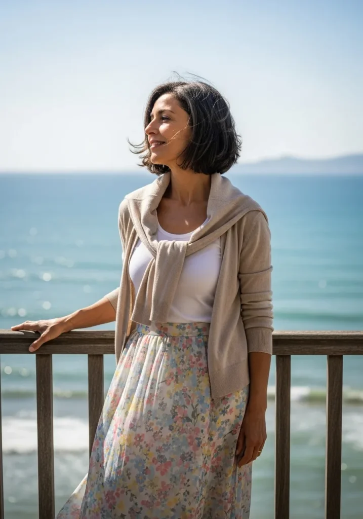 A light cardigan sits over a white tank and a flowing floral skirt. Soft tones and airy fabric make the look gentle and calm. The sweater around the shoulders adds a relaxed touch that still feels refined.