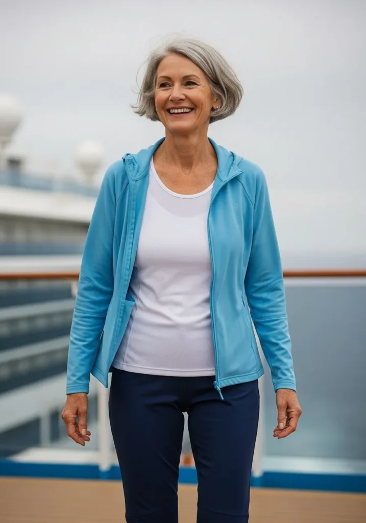A pale blue jacket sits over a white top and navy active pants. The fabrics feel smooth and stretchy which keeps the outfit practical for walking around the ship. The simple pieces work well together and stay comfortable in changing weather.