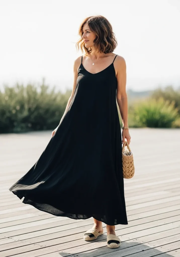 A simple black maxi dress flows softly with every step and feels light in warm weather. The thin straps and relaxed cut keep the whole look breezy while the fabric moves in a graceful way. Woven slides and a small straw bag add a natural touch that keeps everything casual and effortless.