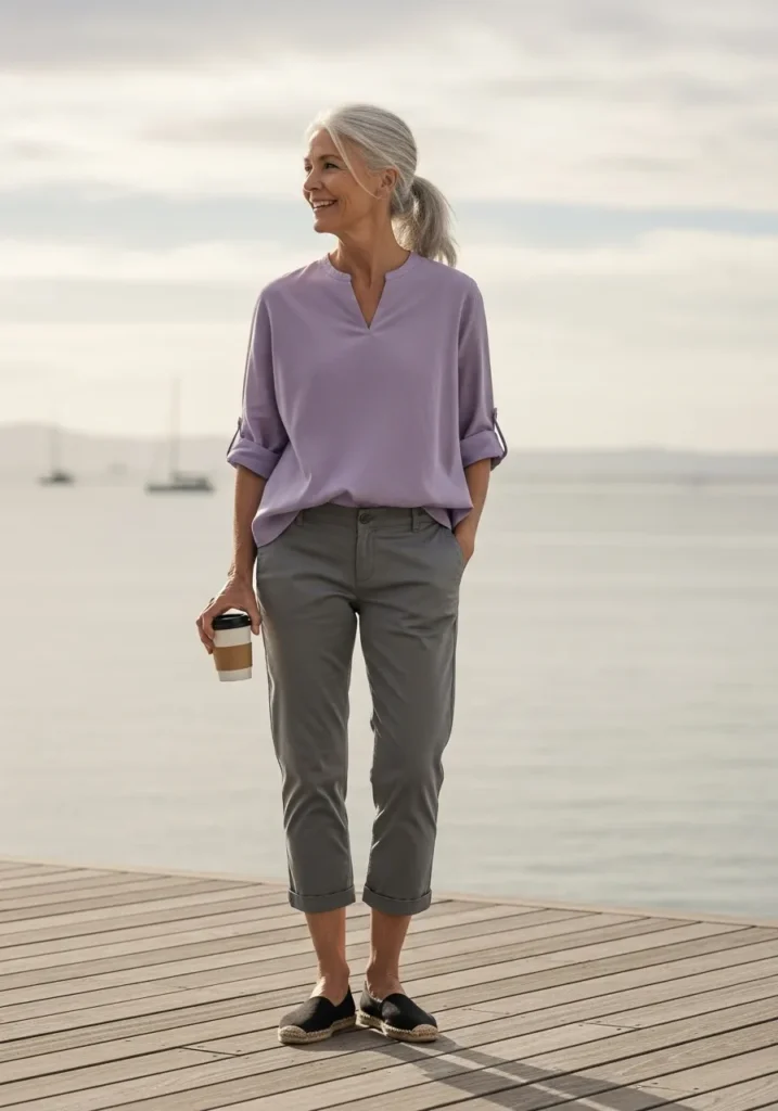 This outfit pairs a relaxed lavender blouse with rolled sleeves and soft grey cropped trousers. The espadrilles add texture and make the look ready for a slow seaside walk. The tones feel calm and gentle which makes the outfit very wearable.
