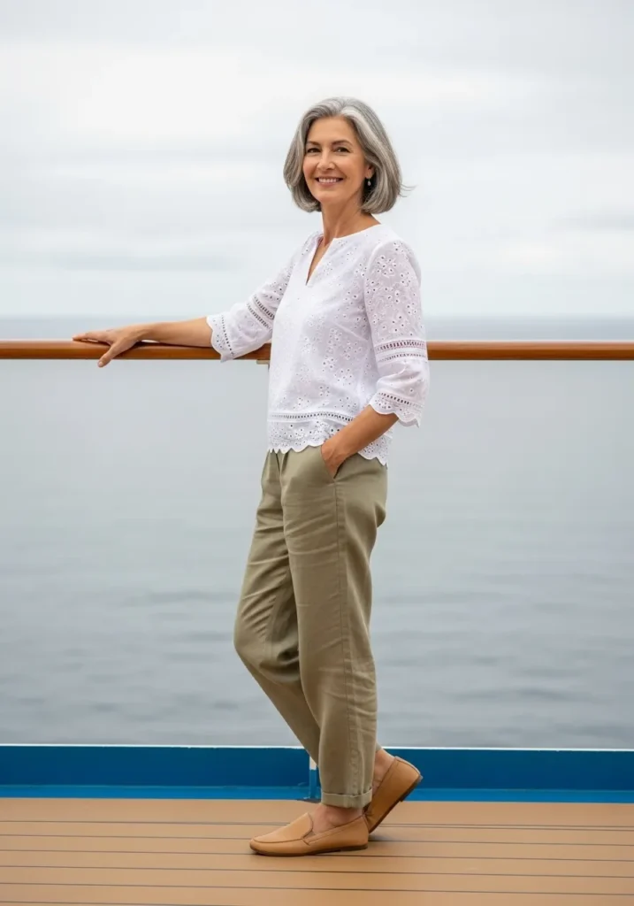 This look pairs a breezy white eyelet blouse with soft khaki linen trousers for an outfit that feels effortless and polished at the same time. The top has pretty embroidered details and a scalloped hem that add a touch of femininity, while the loose fit keeps everything comfortable on warm cruise days. The straight leg trousers balance the look beautifully and the tan loafers tie it all together with a classic, grounded feel. It is the kind of outfit that looks instantly put together without trying too hard.