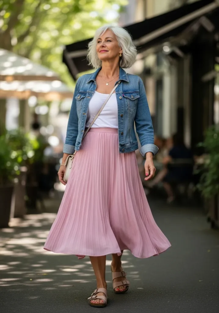 I think this outfit works so well because it balances structure with flow. The skirt moves beautifully and brings a really youthful energy while the denim jacket gives that hint of cool laid back style. It is the kind of combination that always feels fresh and flattering. Plus the colors are soft and pretty which makes it feel especially charming for a cruise setting.