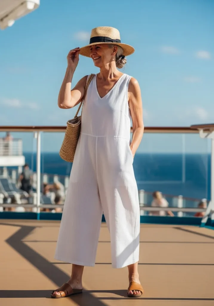 I adore how streamlined this look is. A white jumpsuit always feels modern and flattering without needing much else. The accessories give it that effortless resort vibe that feels right at home on a cruise. It is comfortable, simple to wear, and has a quiet elegance that still stands out in the best way.