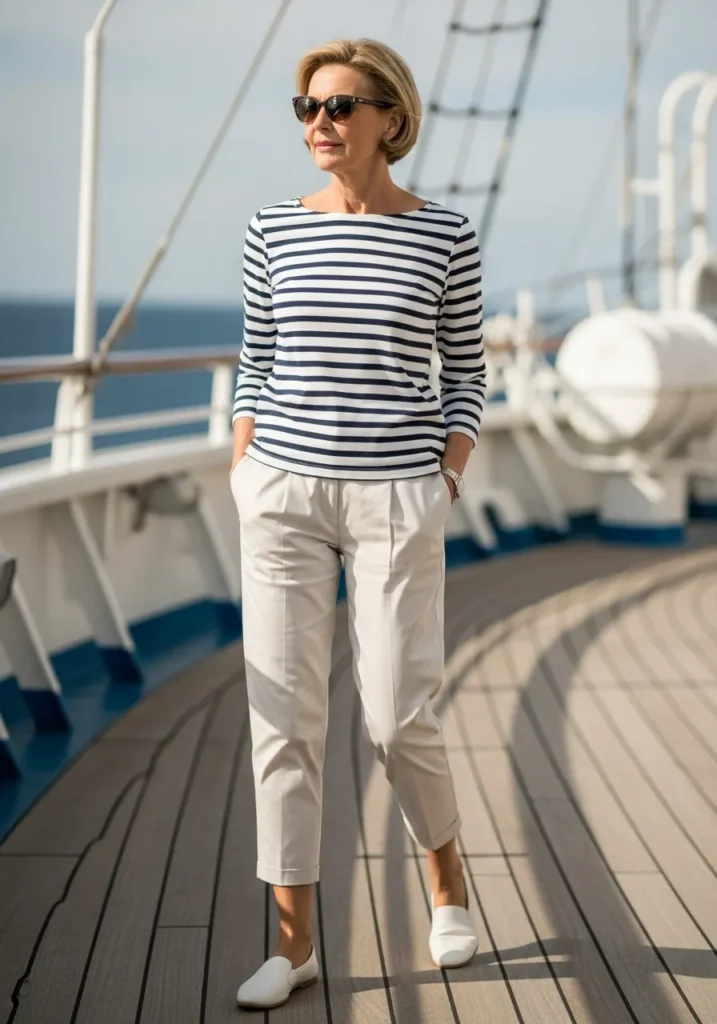 The outfit pairs a navy striped boatneck top with tailored off white trousers. The clean lines make the look sharp while still feeling casual. Simple white loafers finish the outfit with a neat touch that works on any sunny day at sea.