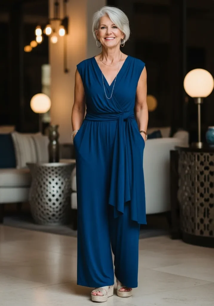 This look shows a rich blue wrap style jumpsuit with a soft drape and a tied waist that shapes the figure in a gentle way. The wide legs add movement and the metallic sandals lift the outfit for dinners or evening strolls indoors.