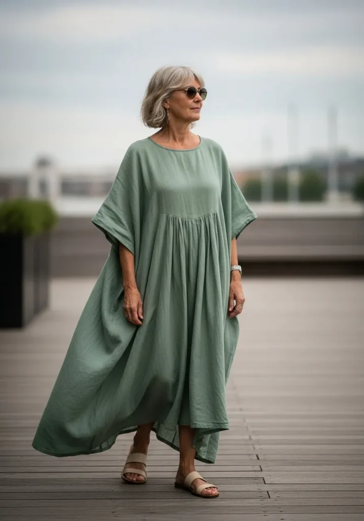 The outfit features a soft sage green dress with a loose draped shape that moves beautifully with every step. The wide sleeves and gathered waist create an easy relaxed line while the airy fabric keeps everything light. Simple nude sandals and round sunglasses finish the look with a calm understated balance.