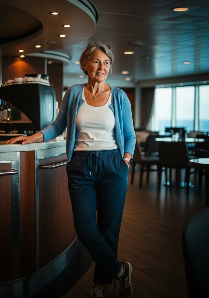 This look pairs a white tank with a powder blue cardigan that adds just enough warmth indoors. The navy joggers bring a relaxed feel and the soft sneakers keep things practical for wandering around the ship. The outfit has that comfy casual energy that still feels neat.