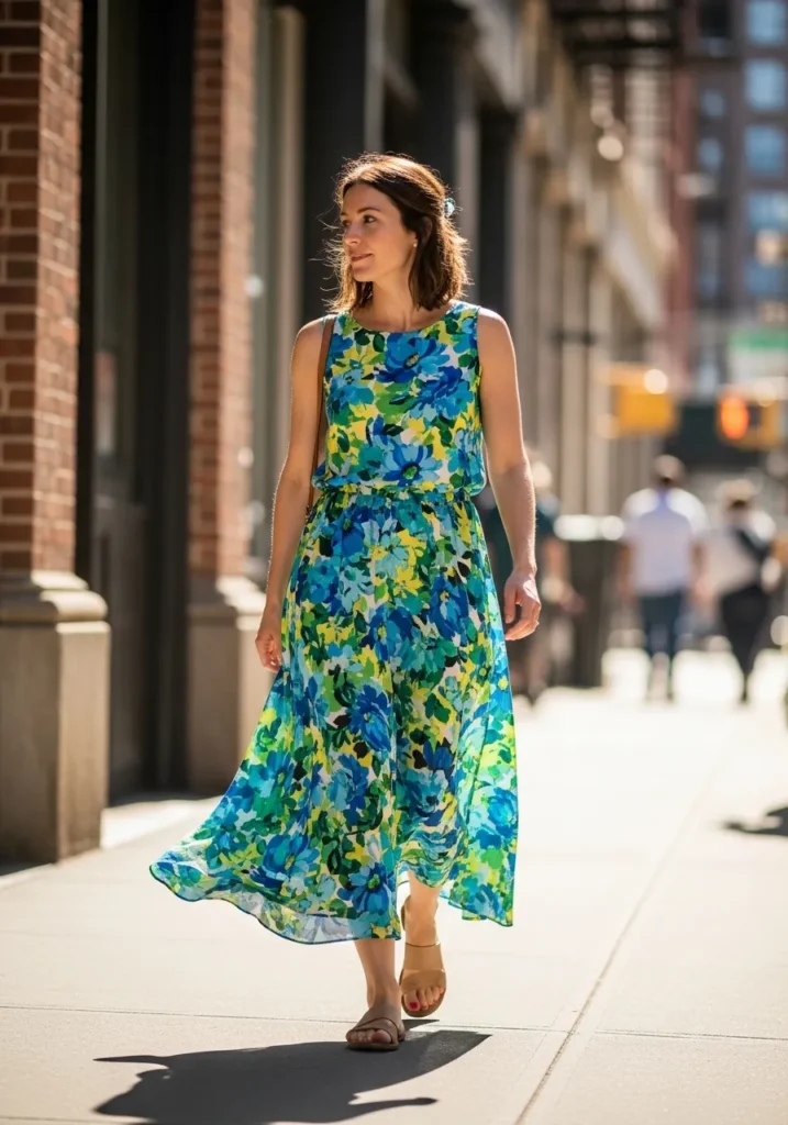This bright floral maxi dress blends greens blues and yellows in a flowing print that moves beautifully. The sleeveless shape keeps things cool while the soft fabric drapes effortlessly. The tan sandals balance the bold colors with a grounded feel.