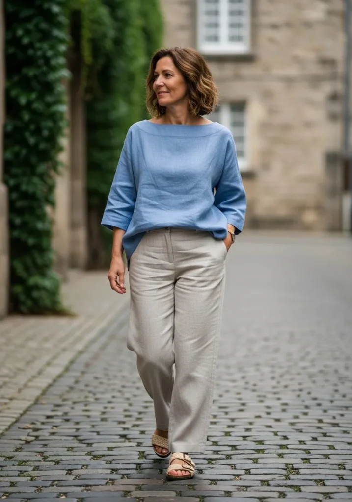 The soft blue top drapes in a gentle boatneck shape while the beige wide leg pants give the outfit a breezy tailored feel. The fabrics look natural and breathable which is perfect for warm weather. The neutral sandals keep the outfit calm and balanced.