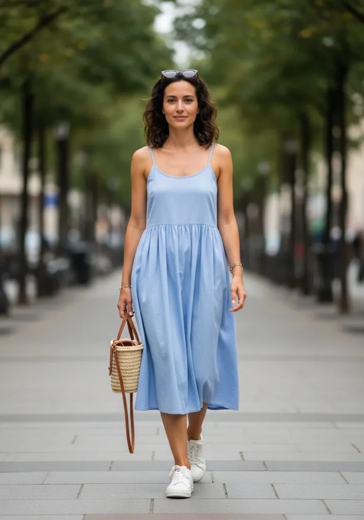 A soft blue sundress with thin straps flows in a gentle A-line shape and feels breezy from top to hem. The cotton fabric moves well as she walks and pairs effortlessly with white sneakers. A woven bucket bag adds a sweet warm touch that fits the relaxed mood of a warm morning stroll. The whole look feels calm and simple with just enough polish to feel intentional.