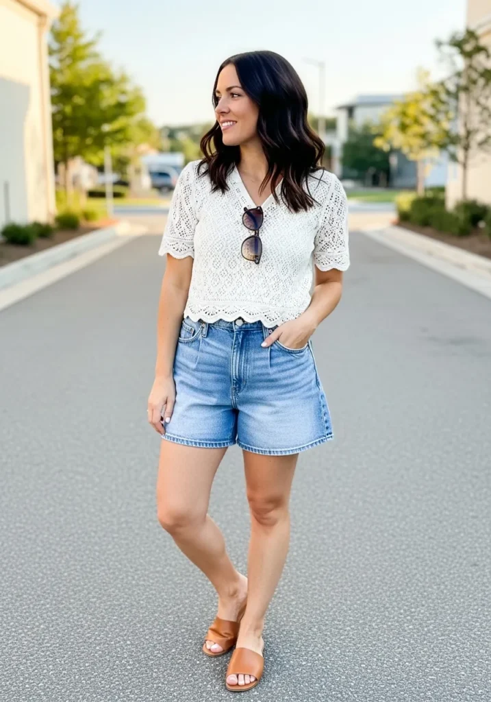 A white crochet top adds a sweet textured look while still feeling cool and breathable. It pairs easily with light denim shorts that sit high on the waist and fall in a relaxed shape. Tan slides and sunglasses keep everything simple and summery for a carefree travel morning.