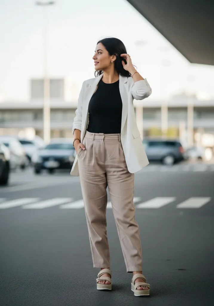 I love this kind of outfit because it strikes that sweet spot between chic and comfortable. The blazer makes me feel put together right away and the neutral trousers keep things soft and easy. The sandals are a quiet miracle since they look stylish but still let me move through the terminal without any wobbling.