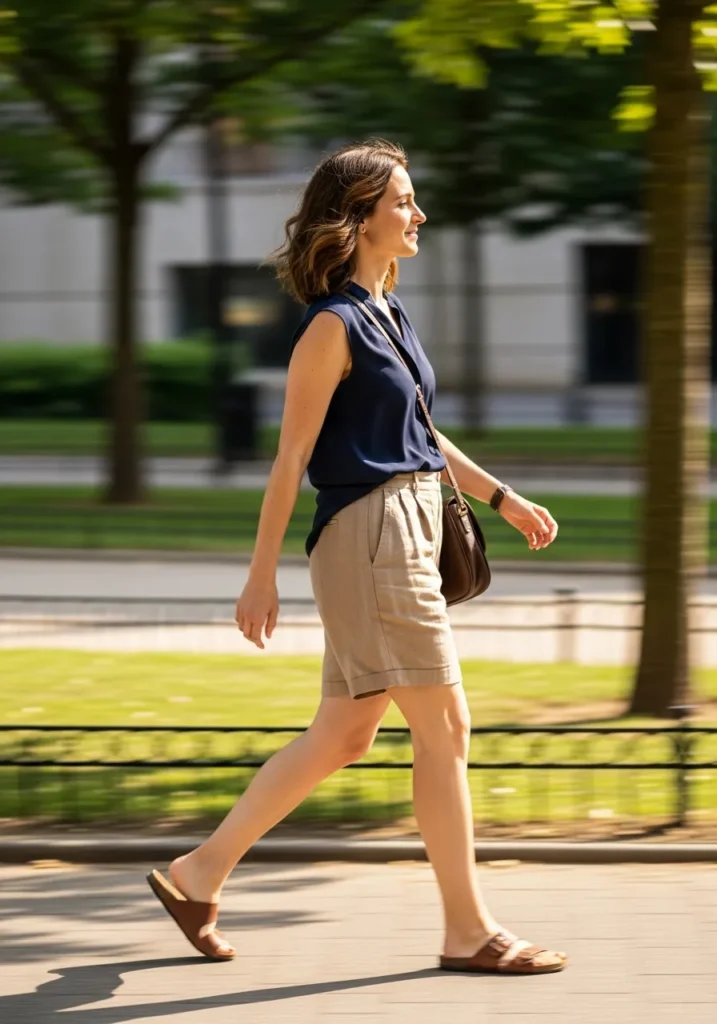 A navy sleeveless top sits neatly against soft beige tailored shorts creating a clean warm weather outfit. The mix of deep blue and light neutrals feels calm and classic. Brown slide sandals and a compact crossbody bag finish the look with simple effortless charm.