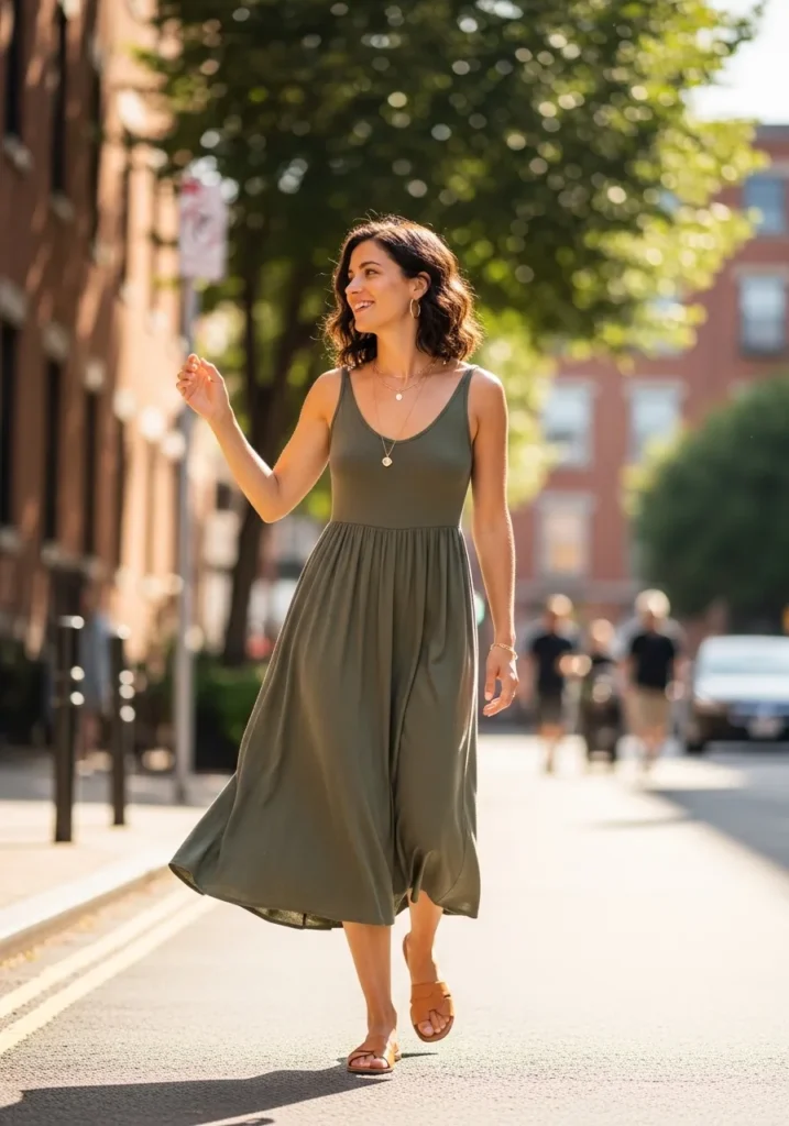 A flowy olive green midi dress with thin straps moves beautifully with every step. The fabric skims the body in a soft gentle way that feels relaxed and flattering. Tan sandals and layered gold jewelry add warmth and make the outfit feel quietly elegant.