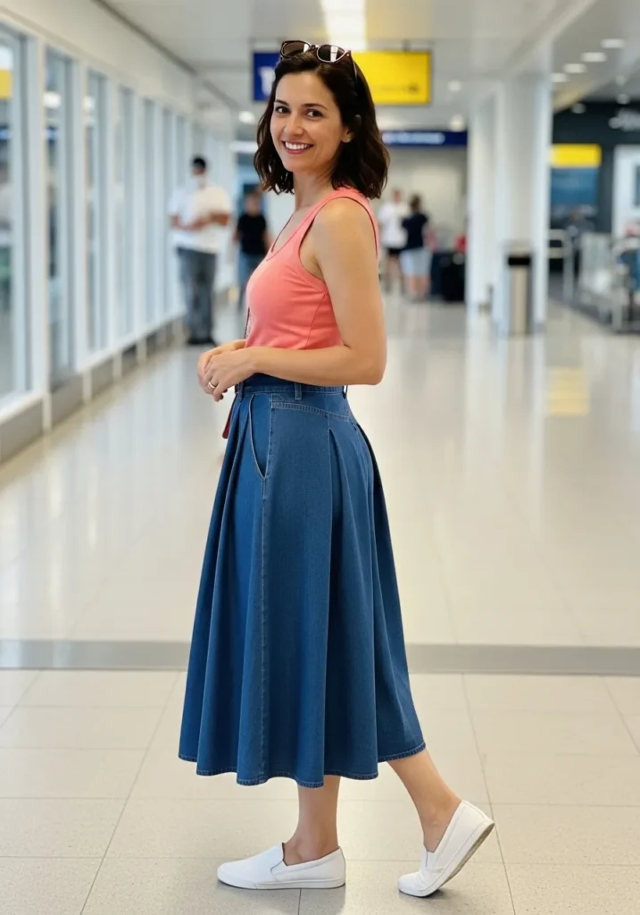 A bright coral tank pairs with a full denim midi skirt that swings softly with each step. The skirt’s structure balances the playful top and white slip on sneakers keep everything clean and comfortable. Sunglasses on the neckline add a cute casual touch that fits the travel mood.