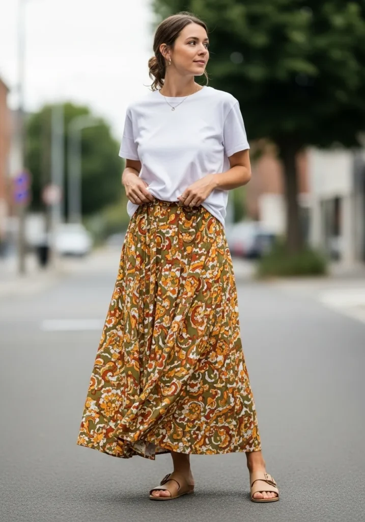 A crisp white tee gets paired with a flowing maxi skirt covered in warm earthy patterns that bring a playful mood to the entire outfit. The skirt moves with every step which makes it feel perfect for a day filled with excitement. Tan slide sandals keep the look casual and light for warm weather.