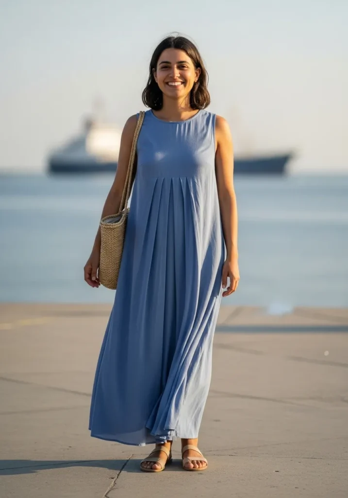 A soft blue pleated maxi dress creates a relaxed silhouette that feels gentle and breezy. The pleats add a bit of texture and the lightweight fabric keeps everything cool. Simple sandals and a woven shoulder bag bring a natural warm contrast that fits the coastal setting perfectly.