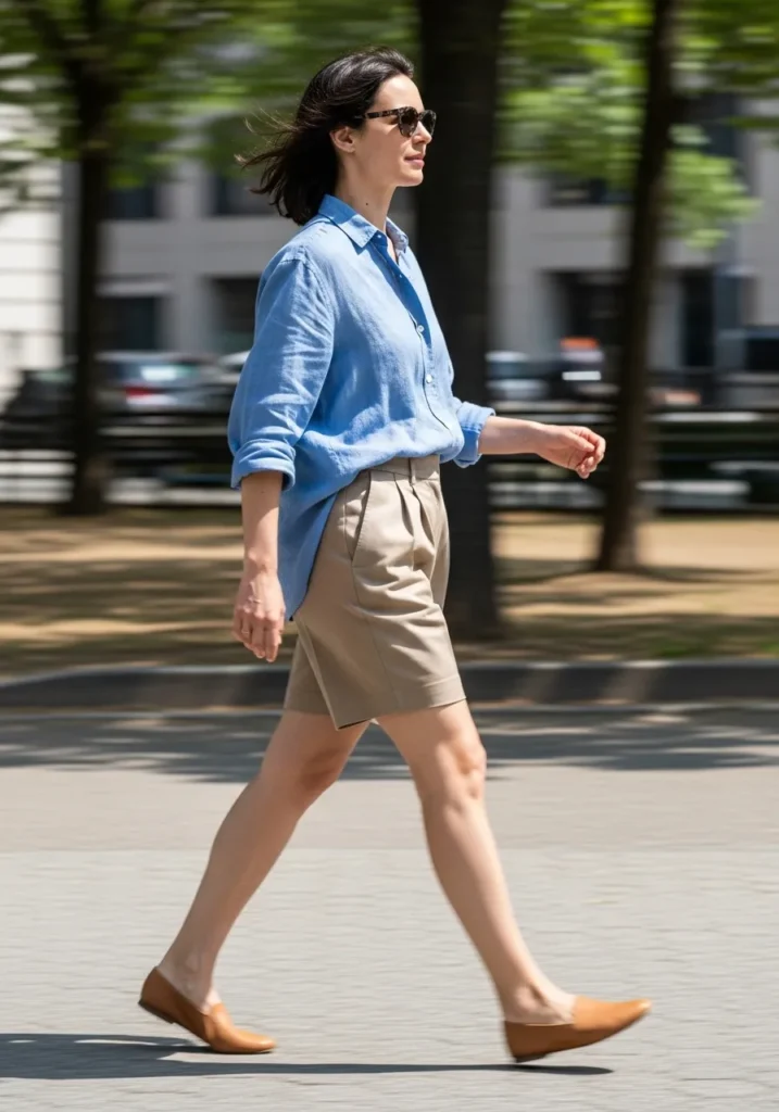 A relaxed light blue button down shirt pairs effortlessly with soft beige tailored shorts. The sleeves are rolled slightly for a casual feel and the shorts keep things neat and structured. Brown flats pull everything together with a simple timeless touch.