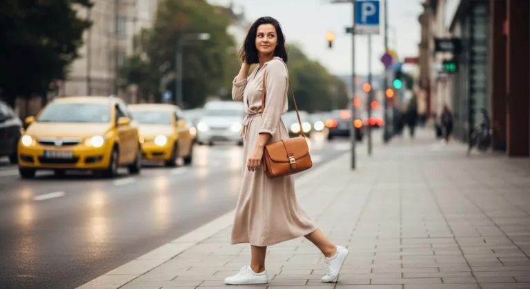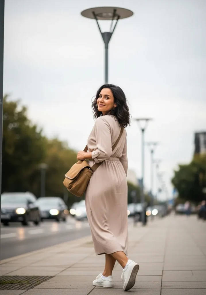 A taupe midi dress with long sleeves offers a soft draped silhouette that feels relaxed and refined. The elastic waist gives a little shape while white sneakers add a fresh casual contrast. A tan crossbody bag keeps things practical and ties the outfit together with warm tones.