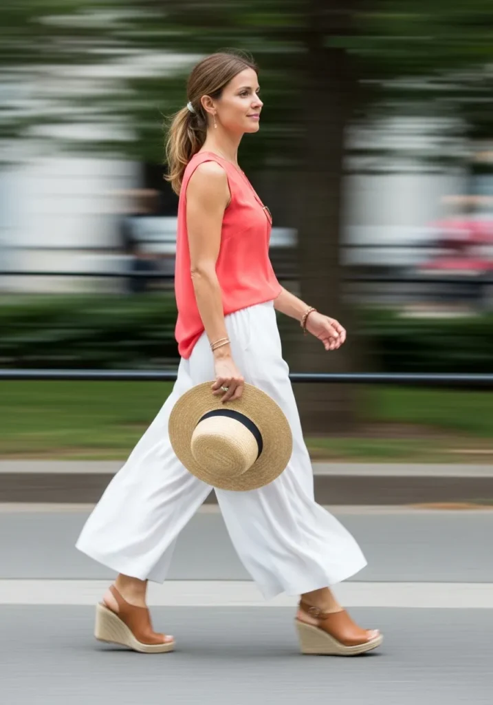 A coral sleeveless top blends beautifully with breezy wide white pants that glide with each step. The lightweight fabrics soften the bold color and create a warm contrast. A pair of tan espadrille wedges lengthens the silhouette and gives the outfit a quiet vacation glow. She carries a straw hat by hand which adds charm and texture.