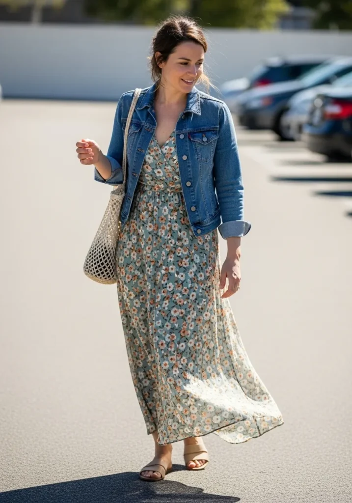 A floral maxi dress moves gently in the breeze with its soft pattern and easy wrap shape. A denim jacket sits lightly on top and brings balance to the floaty print. Simple sandals and a netted tote keep the look grounded and practical for a warm day full of waiting spots and small errands before boarding.