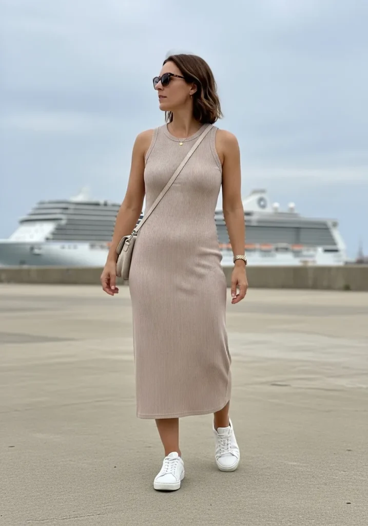 A ribbed knit midi dress in a soft beige tone follows the body in a smooth straight line. White sneakers keep the look easy and practical while a small crossbody bag in a matching shade ties everything together. Sunglasses and minimal jewelry round out the clean understated style.
