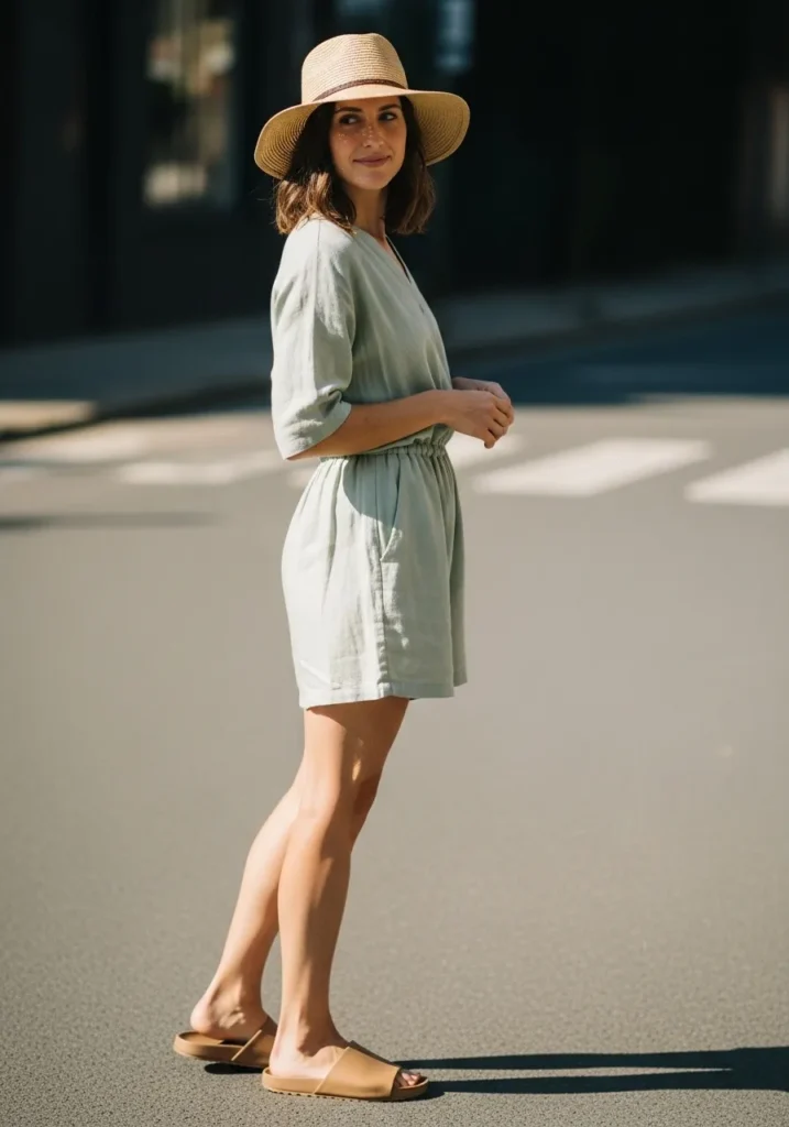 A light sage romper with a relaxed fit gives this look an effortless charm. The elastic waist adds a little shape while the soft fabric keeps everything airy and comfortable. Simple tan slides and a classic straw hat complete the outfit with a warm touch that feels perfect for sunny weather and unhurried travel moments.