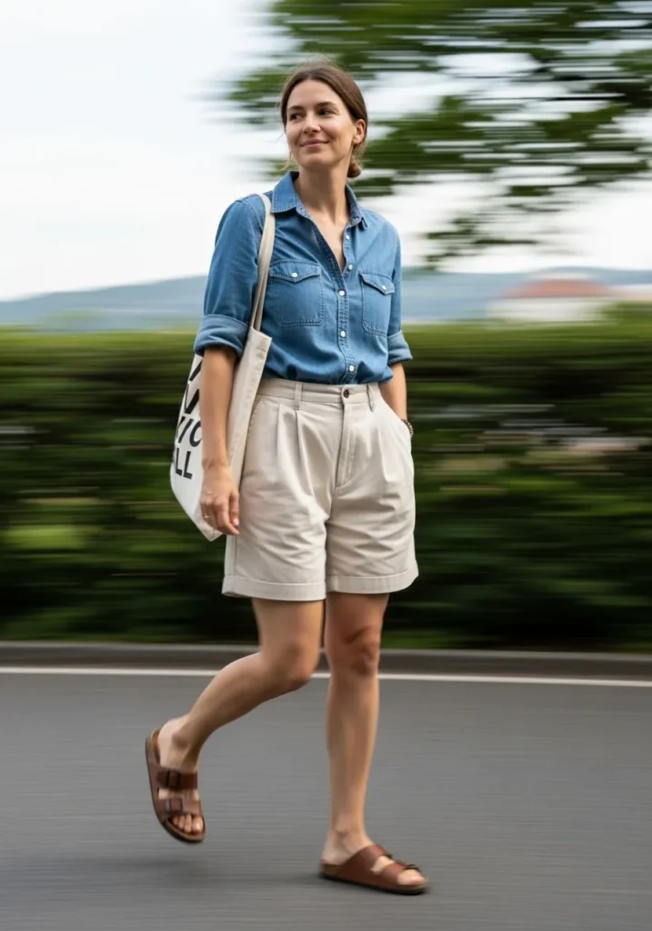 A soft denim button down pairs with relaxed high waisted beige shorts for a look that feels casual but still intentional. The rolled sleeves keep it cool and the roomy tote adds a practical touch. Brown slide sandals bring in a warm classic feel that works beautifully for a day spent on the move.