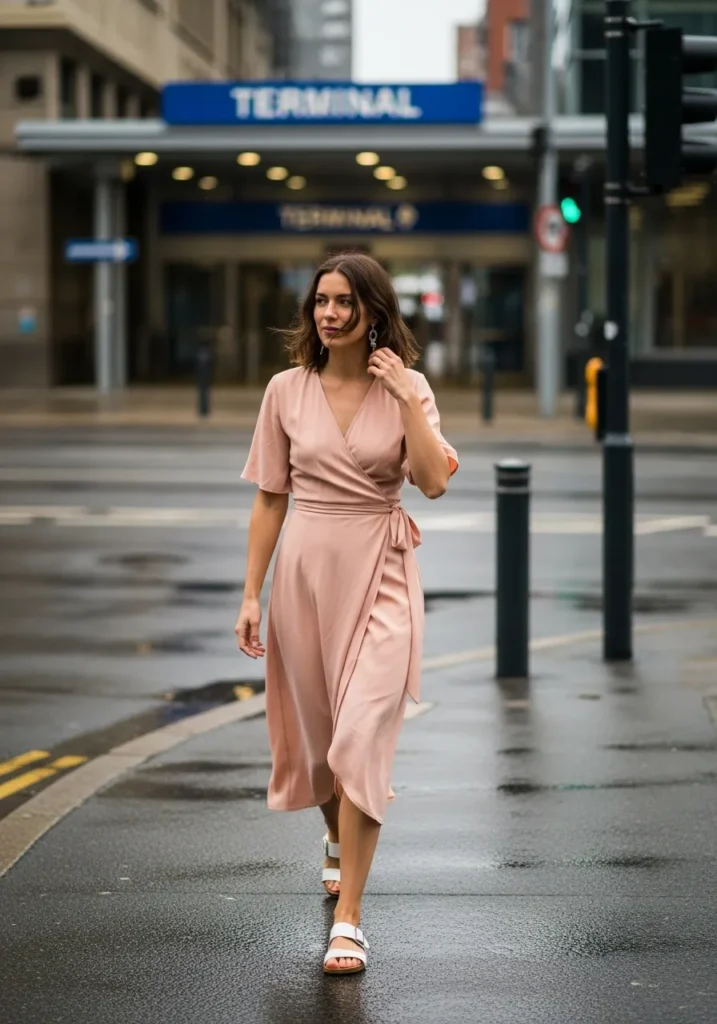 A blush wrap dress moves gently with every step thanks to its smooth fabric and fluttery sleeves. The wrap tie shapes the waist and the skirt drapes in a flattering flowy line. White slide sandals keep the outfit simple and fresh which lets the dress stand out without feeling fussy.