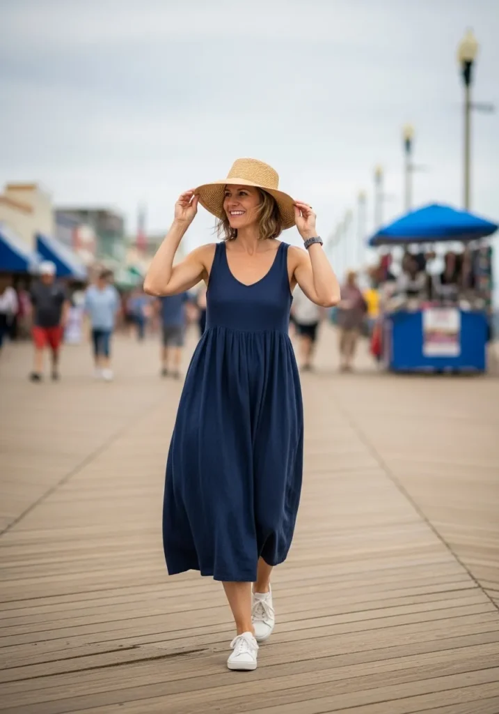The outfit features a loose navy sundress made from a soft lightweight fabric that moves easily in the breeze. The deep scoop neckline keeps things relaxed while the midi length adds an effortless touch. A straw hat brings a sunny charm and white sneakers keep the whole look practical for walking along the pier or wandering the ship. Everything works together with a casual vacation feel that feels unfussy and easy.