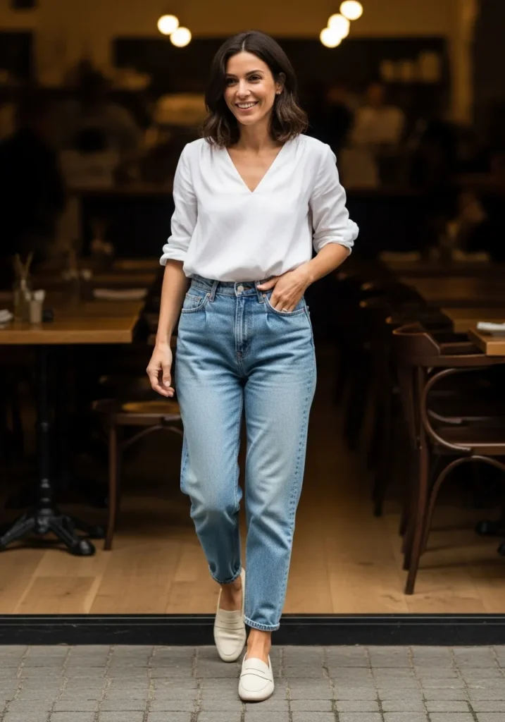A crisp white blouse tucks into classic light wash denim for a timeless polished outfit. The blouse has a soft V neckline that feels easy and feminine while the straight leg jeans bring a relaxed shape. Cream loafers tie everything together with a gentle minimalist touch. The whole look feels understated and chic at the same time.
