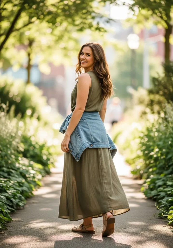This look features a soft olive maxi dress with a relaxed drape that feels calm and natural. A light denim jacket is tied around the waist which adds shape and brings in a touch of texture. Neutral sandals keep the outfit easygoing and the sleeveless cut makes the dress perfect for warm sunny days. Everything blends into a soft earthy vibe.