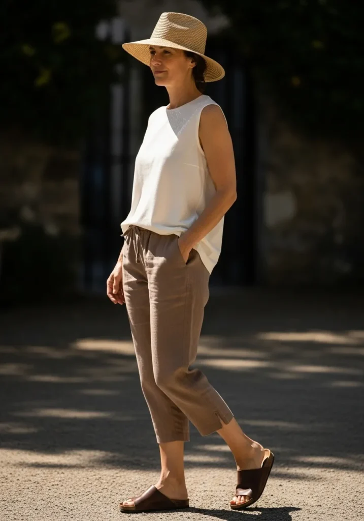 This outfit brings together a soft white sleeveless top and cropped taupe linen pants for a look that feels calm and breathable. The fabrics move gently and the neutral palette keeps everything simple and timeless. A woven sunhat adds a sweet vacation touch and dark brown slides finish the look with effortless ease. It feels perfect for warm days spent exploring charming coastal towns.