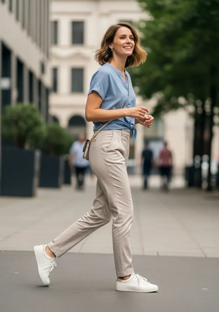 A light blue blouse with a tie front pairs beautifully with slim beige trousers for a clean modern look. The blouse has a soft drape that feels airy while the trousers keep their shape with a smooth flattering fit. White sneakers bring in a fun casual detail and a tiny crossbody bag adds a neat finishing touch. Everything feels bright and stylish in a relaxed way.