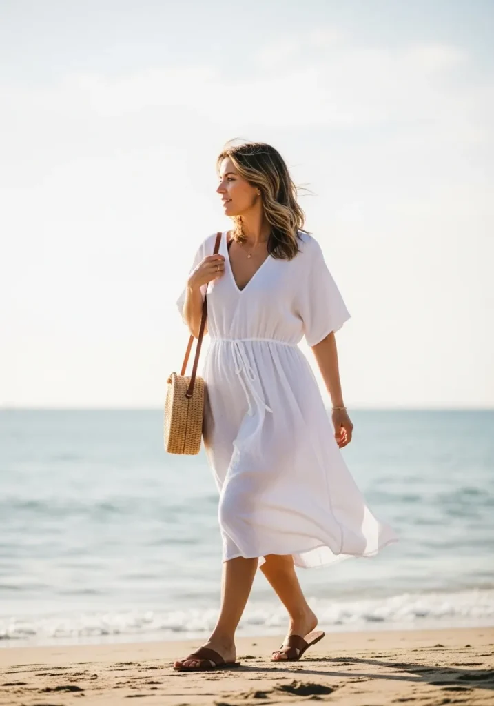 This look features a breezy white beach dress with a gentle V neckline and a subtle drawstring waist that gives a soft shape. The fabric moves gracefully in the wind and the loose sleeves add a dreamy lightweight feel. Brown slide sandals and a woven bag complete the outfit with natural textures that suit the shoreline perfectly.