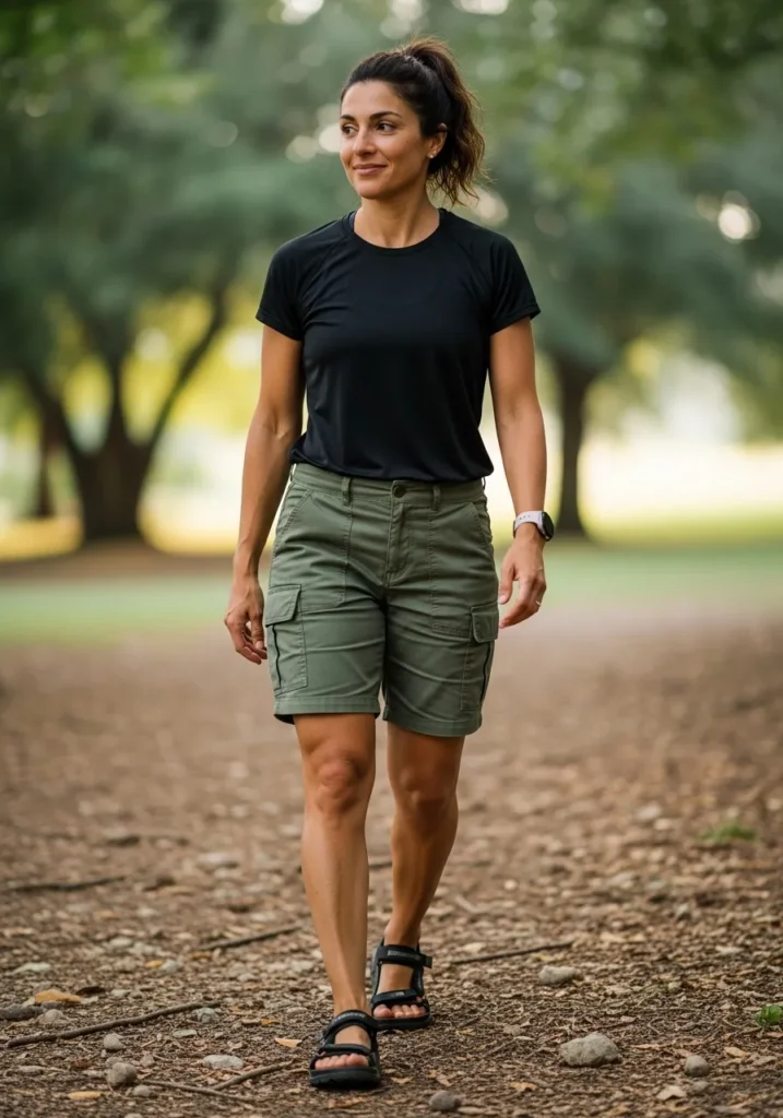 This look pairs olive cargo shorts with a fitted black top for a simple outdoor style. The shorts have a soft structured fabric that offers movement without feeling stiff and the black tee adds a clean sporty finish. The strappy sandals make the outfit ready for easy excursions where walking is part of the plan. The whole vibe feels active and practical but still feminine.