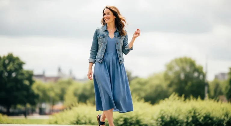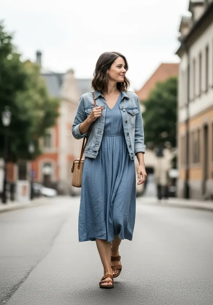 This outfit blends a soft blue midi dress with a light denim jacket for an easy layered style. The dress has a gentle flow and the denim adds structure without feeling heavy. Brown sandals and a woven crossbody bag complete the look with warm natural tones. It feels friendly and classic at the same time.