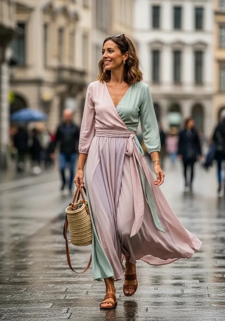 This wrap dress blends muted rose and sage tones in a silky flowing fabric that moves beautifully. The wrap shape defines the waist in a natural way and the long skirt adds a floaty romantic feel. A straw tote and brown sandals finish the outfit with an airy warm weather touch. It feels elegant yet still relaxed enough for everyday vacation exploring.