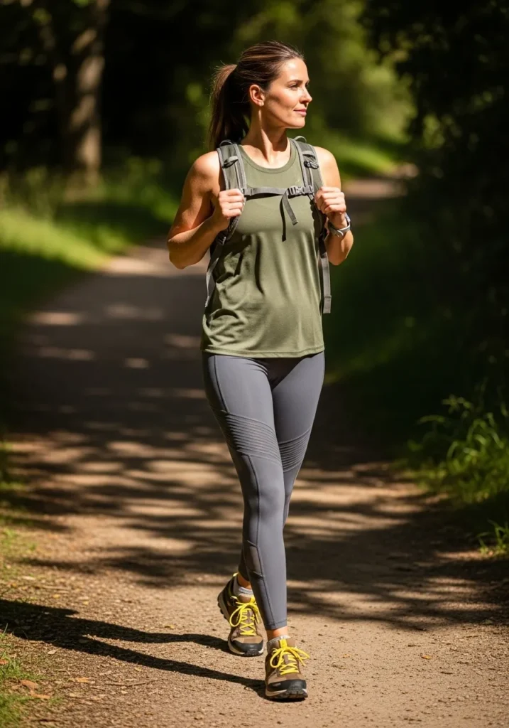 Here the outfit centers around sleek gray leggings paired with an olive tank top for a sporty functional style. The leggings have smooth structured panels that contour the legs in a flattering way while the tank keeps things cool and simple. A sturdy backpack and trail shoes make the outfit perfect for more active excursions. It feels strong and outdoorsy without adding any bulk.