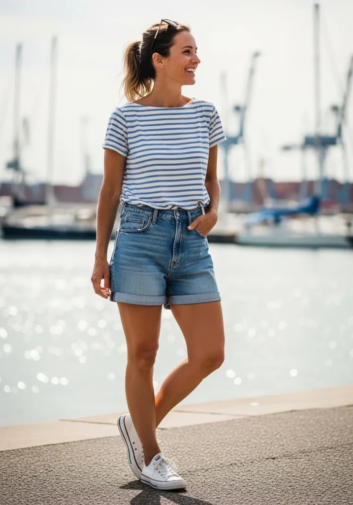A classic striped tee pairs with rolled denim shorts for a timeless coastal look. The top has a soft relaxed cut while the shorts keep things simple with a medium wash that feels casual and fresh. White sneakers tie the whole outfit together and the sunglasses add a sunny carefree detail. The vibe is cheerful and laid back perfect for strolling near the water.