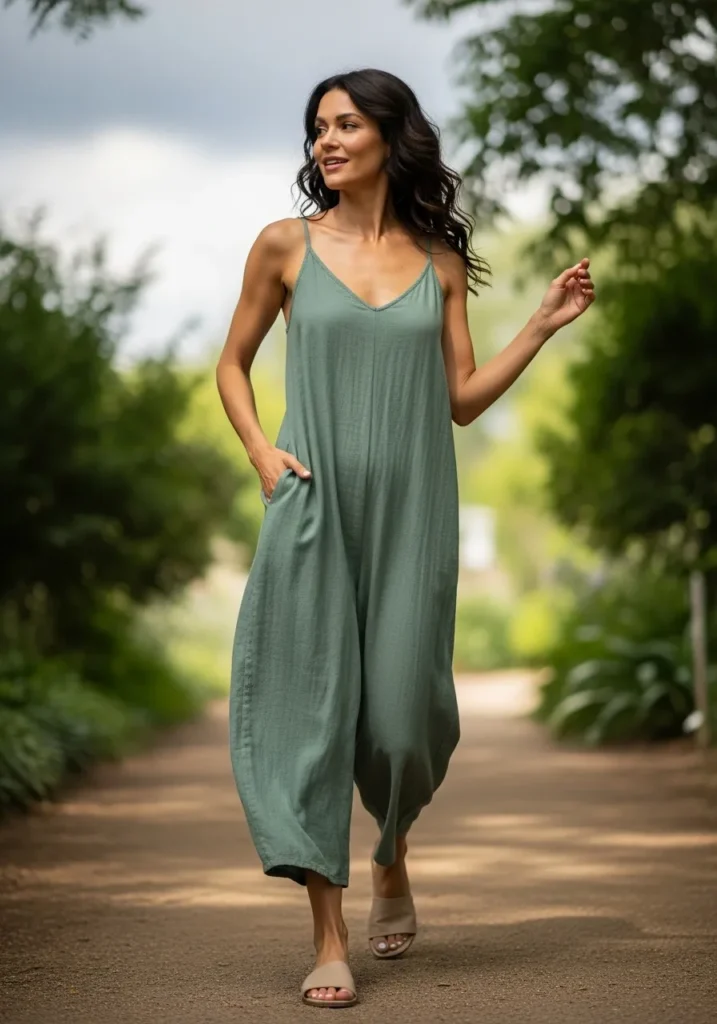 This relaxed wide leg jumpsuit comes in a soft sage green fabric that drapes beautifully with every step. Thin straps and a gentle V neckline keep the top light while the roomy legs create an effortless flow. Neutral slide sandals finish the look with a minimal touch. The whole outfit gives off a breezy calm vibe that feels perfect for warm weather exploring.