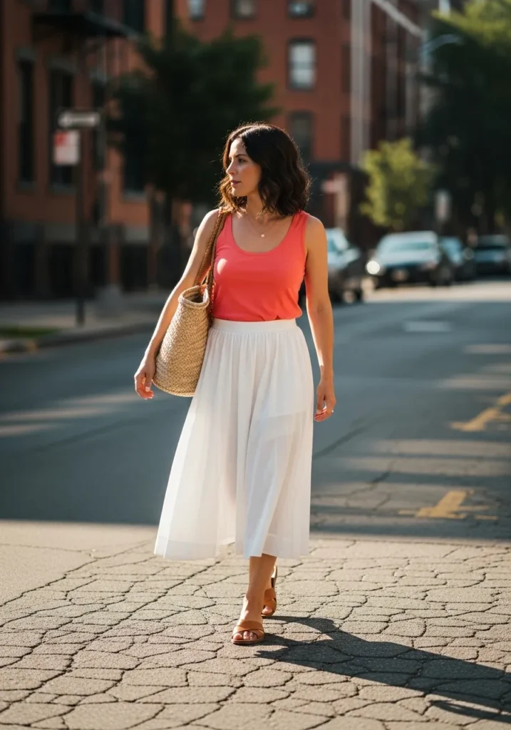 This outfit pairs a bright coral tank with a soft flowy white maxi skirt for a look that feels light and warm. The skirt has a gentle sheer layer that moves beautifully and the coral top adds a cheerful pop of color. A woven tote and simple tan sandals complete the look with that relaxed summery feel that works for city exploring or seaside wandering.