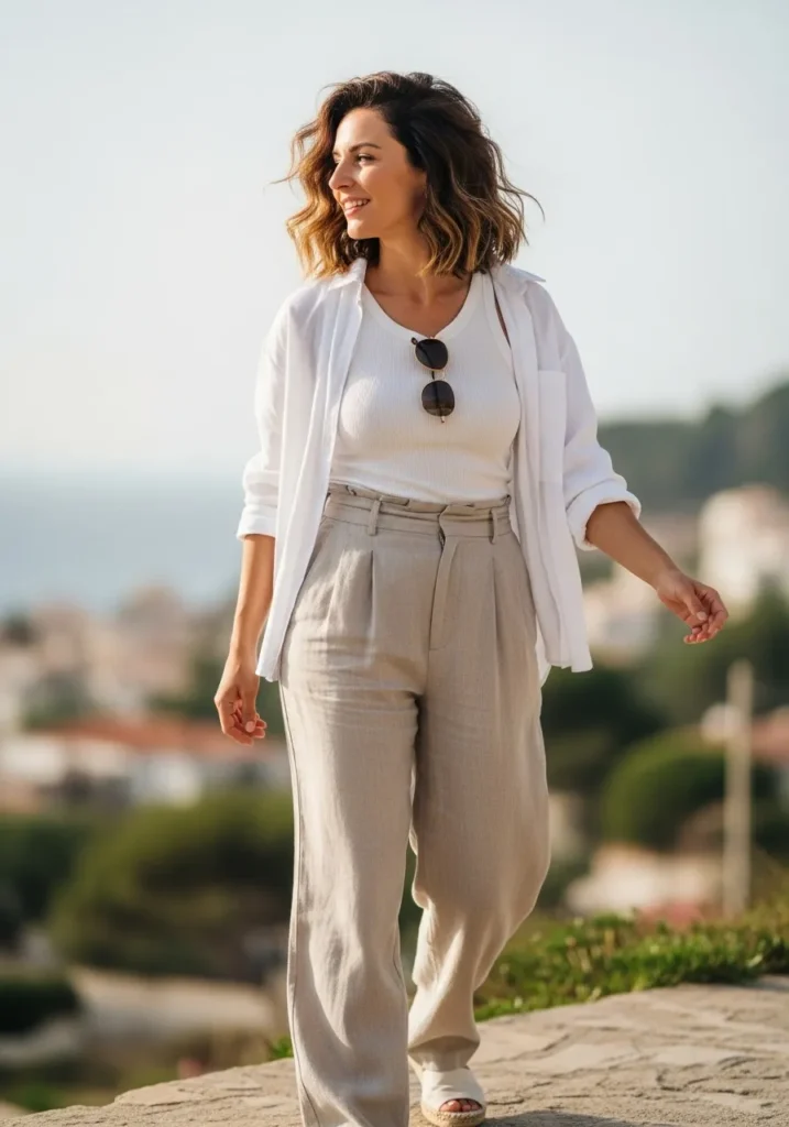 This look blends soft neutral tones with a ribbed white tank, an open white button down, and lightweight beige trousers. The linen fabric drapes in an easy natural way while the relaxed shirt adds a touch of effortless polish. Simple slides and sunglasses tucked at the neckline make the outfit feel ready for anything from strolling the ship to exploring a quiet coastal town.