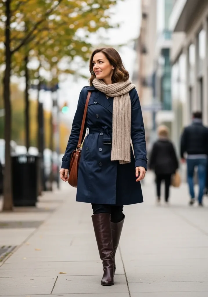 This polished fall look brings together a navy trench coat, tall brown boots, black leggings, a soft beige scarf, and a simple crossbody bag. The coat’s belt shapes the waist in a clean and classic way while the mix of warm and cool tones makes the whole outfit feel crisp and seasonal.