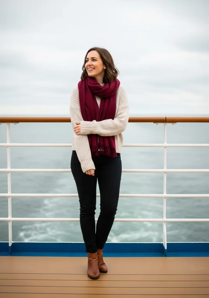 I think this outfit works so well because it is simple and warm. The sweater brings rich fall color and the jeans keep it classic. It is the kind of look I wear when I want comfort without losing style on a cruise day.