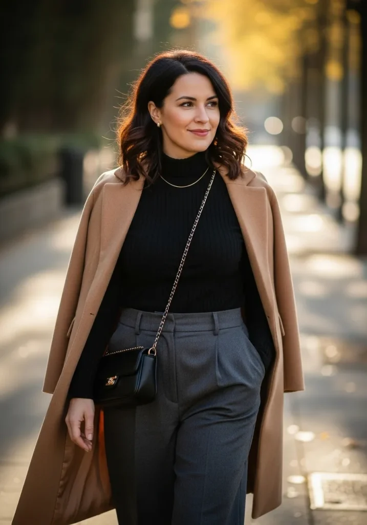 This outfit pairs a sleek black ribbed turtleneck with tailored gray trousers and a long camel coat draped softly over the shoulders. A small black chain bag adds a polished touch and the whole look feels warm, structured, and elegant for a crisp fall day.